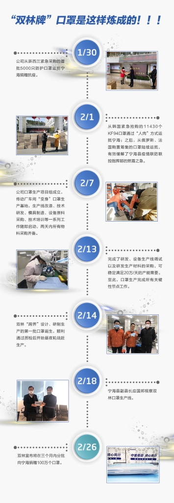 “买不到怎么办?那就自己造!”公司做出了这样一个“硬核”的决定,将援助行动从捐款、捐物,扩大到利用现有设备资源和技术“跨界”生产口罩。说干就干,这就是双林风格。从2月7日立项到2月14日,首批“双林牌”口罩下线,项目组全体成员昼夜轮战,驰而不息,又完成了一次超越自我的奔跑冲刺!