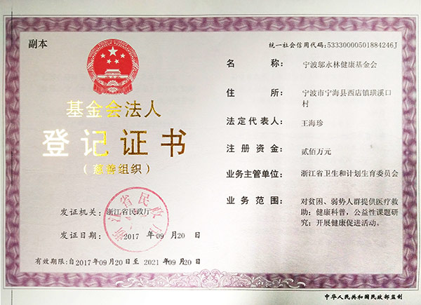 宁波邬永林健康基金会,成立于2010年10月,是在浙江省民政厅注册、由浙江省卫生健康委主管的非公募基金会。基金会的原始基金数额为人民币贰佰万元,来源于华体会体育-华体会体育·(中国)官方网站 。《慈善法》颁布后,本基金会被认定为慈善组织。